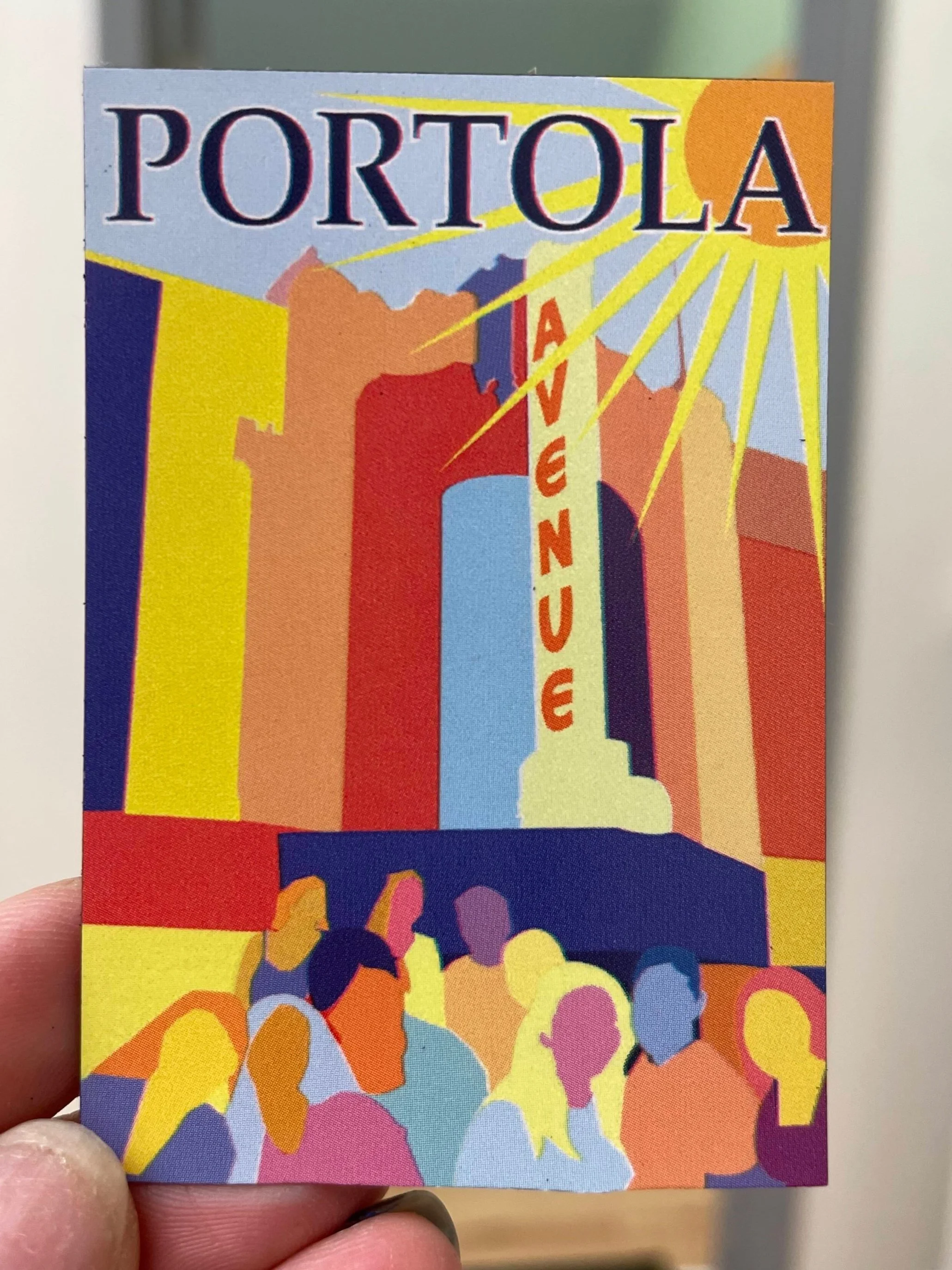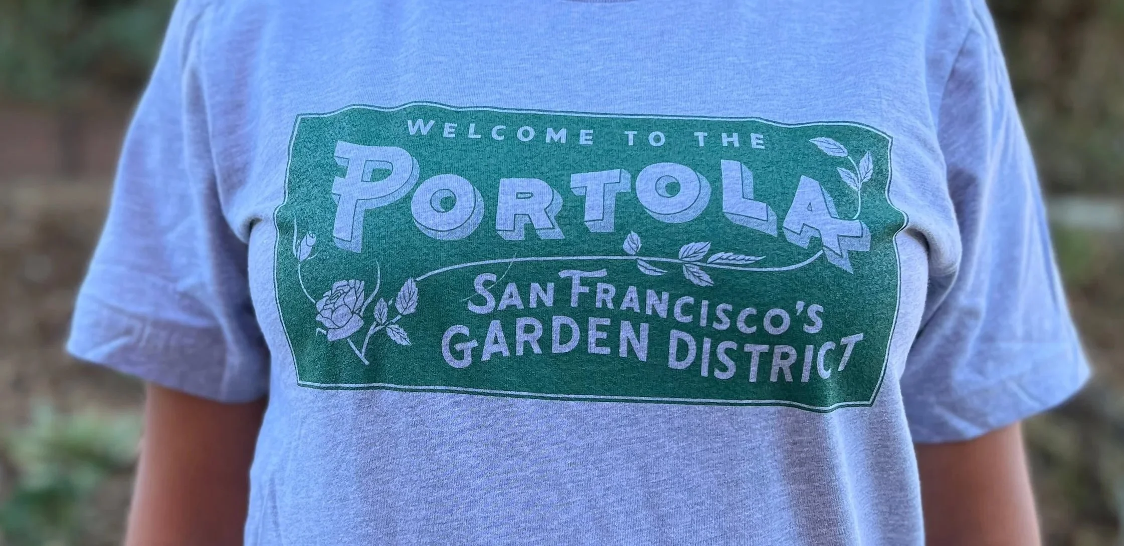 "Welcome to the Portola" t-shirt in gray with a green design.